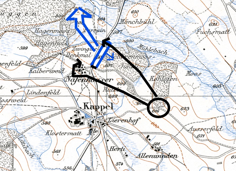 Die Protestanten (blau) bezogen auf der Anhöhe Scheuren Stellung. Die Katholiken (schwarz) griffen über das Buchenwäldli an der linken Flanke an. Durch den überraschenden Doppelschlag geriet das protestantische Heer rasch in Unordnung und wurde vernichtend geschlagen.